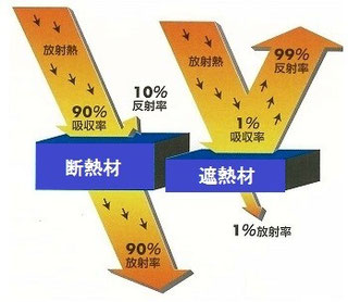 断熱材はその輻射熱のほとんどを通してしまいまう為に断熱性能が高くても時間が経つと結果的にほとんどの熱や冷気の伝導が起きてしまいます。