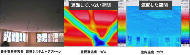 既存の下地を残して遮熱システムのジプトーン仕上げで施工後、室内の温度は29℃でした。