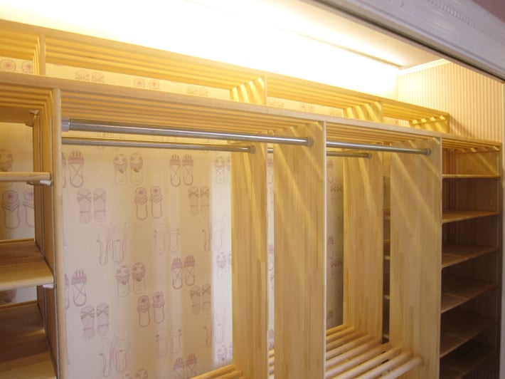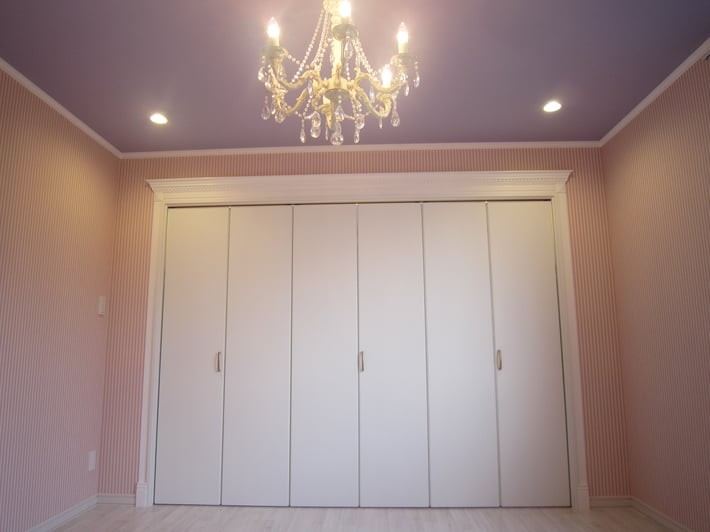 折戸を開けると広大なクローゼットが現れます。 クローゼット正面の壁をメインの壁として表現し、壁には一本も釘やビスを打ち付けずに棚を浮かせて取り付けています。その為に天井の明りだけで正面の壁を立体的に魅せるように出来ました。世界中の子供たちに大人気の英国ハーレクイン社製のバレエシューズ柄をコーディネイトしました。