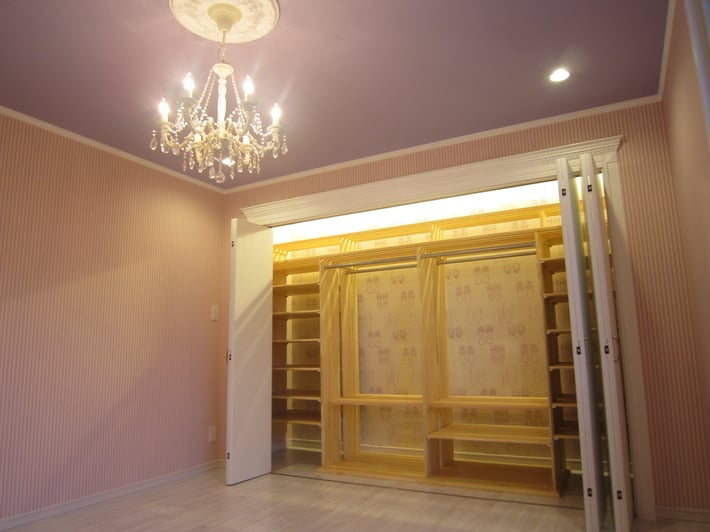 ヨーロピアンな飾り枠をお姫様ティストにデザインしました。 発想を変えて、収納をお部屋のメインにしています。 次の画像をご覧ください。